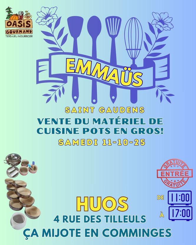 Emmaüs Saint Gaudens sera présente à la seconde édition de Ça mijote en Comminges. Samedi 11 octobre 2025 au tiers-lieu Oasis Gourmand, à Huos. Nous vous attendons pour une journée conviviale!